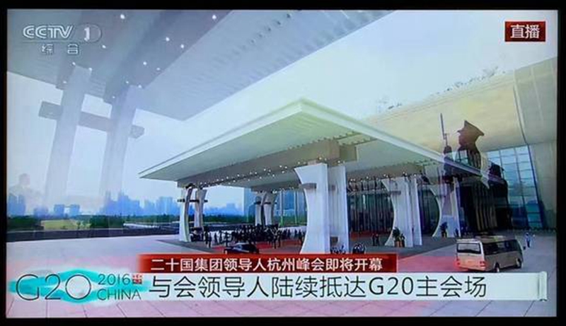 杭州G20峰会主会场(主席台两侧“两柱加一梁”即为“廿”字)(图新华网)