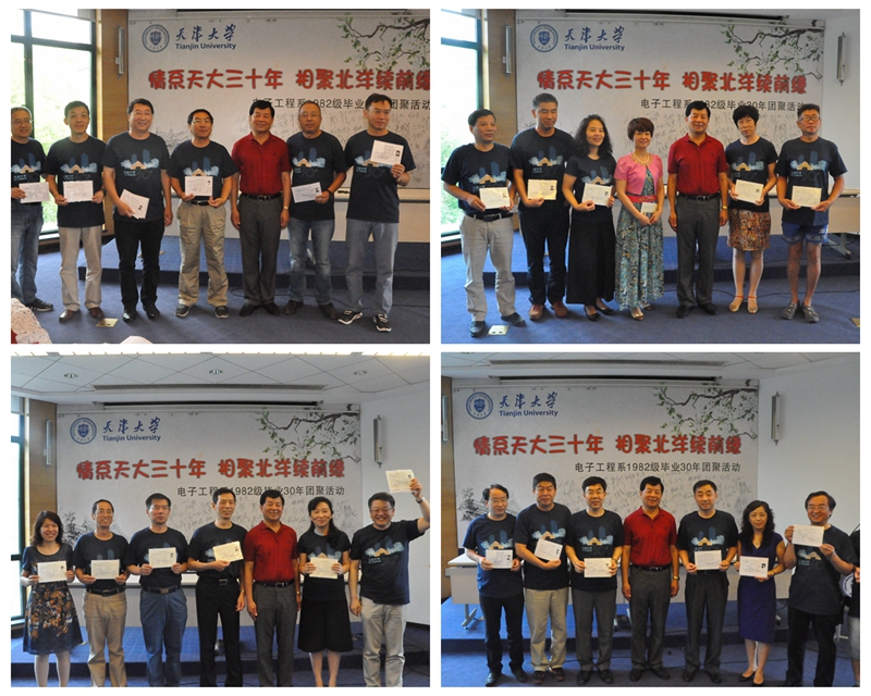 活动第二阶段为班级校友代表发言。首先是无线电技术甲班的秦克景校友,他发自肺腑的表达了浓浓的同窗情谊,“三十年的时光,曾经的青春少年早已斑斑华发,曾经的懵懂与青涩,也早已在时光的长河中,经历了人生百味。但是回首这三十年来,我们的友谊从不曾因岁月的流逝、境遇的变迁而褪色,相反却愈加的香醇与浓郁,如诗如歌”;无线电技术甲班的沈金华校友说道,“三十年后,重走天大校友,深深的感觉到了母校巨大的变化与发展,心中不由地激动与澎湃,三十年前,母校是我们的骄傲,如今,我们依旧为母校感到骄傲与自豪”;在表达母校情之余,无线电技术乙班的朱连兴校友认为,“走出校园的这三十年,其实感触最深,影响自己最大的就是母校教会我如何做人,天津大学一脉相传的踏实奋进、实事求是的学风与作风,早在学生时代就落下了深深印记,督促自己不断努力向前,从而影响了自己一生”;电子仪器甲班的崔惠柳结合自己的人生感受,与同学们分享“回首三十年的时间,不论我们是功成名就,还是默默无闻,能够留下的最大财富就是平安与健康,所以祝愿在座的每一位同学和老师,拥有健康的身体,平安幸福”;同样,电子仪器乙班的张建国校友也从人生经历中,感受到了母校深深的影响,与同学们分享了他的“try”故事,“当年读书的时候,我的英语成绩一直都不好,英语老师一直跟我说要try,大胆的尝试,但是当时并没有迈出那一步,毕业后,经历了社会的洗礼,才发现自己一直都在“try”,在人生的不同阶段,事业的不同领域,自己尝试的步伐从来没有停止,所以现在来看,这种拼搏、大胆尝试的思想一直都是母校教诲自己的。”半导体专业的吴军军校友用一句话道出了校友的心声,“常怀感恩之心,常念同窗之情”,也道出了对同学们的祝福,“人生两个阶段,前半段是用来追求志向与理想,后半段则是追求幸福,所以希望我们的老同学,能够保重身体,幸福快乐”。六位校友代表的精彩发言,虽然言语不同,但是都蕴含了对母校、对老师、对同窗好友的深情,都表达了道不尽的感激之情。