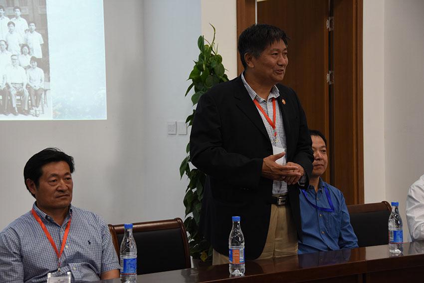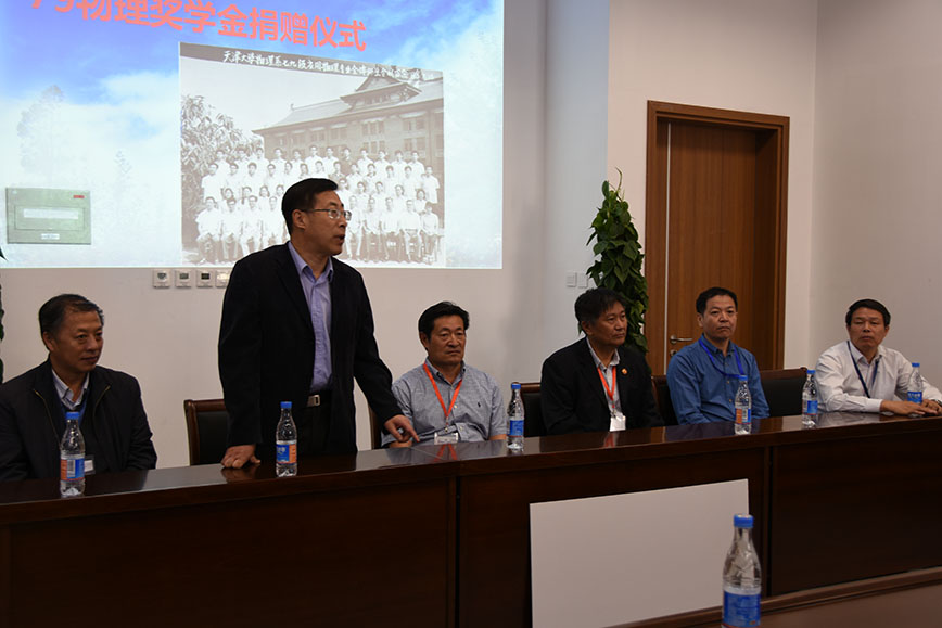 荣喜民代表校北洋基金会、理学院讲话。他在谈话中讲到了两点,第一点是关于物理系的种种历史和辉煌过去,也展望了物理系的美好前景,强调誓要振兴物理系。第二点是感谢校友对理学院物理系发展的支持,对母校的支持。