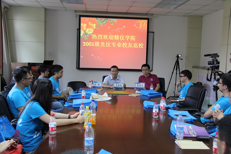 最后,时任精仪学院01级辅导员、现任天津大学校办副主任的袁惠龙老师和精仪学院党委书记王海龙相继赶来。袁惠龙老师和校友们亲切地握手,并和大家一起回忆那段难忘的青葱岁月。王海龙书记向校友们介绍了精仪学院在学科建设、人才培养和师资引进方面的情况,对校友回归母校表示热烈欢迎,也希望校友们能够为社会做出更大的贡献,从而把天津大学的声誉传播得更广更远。