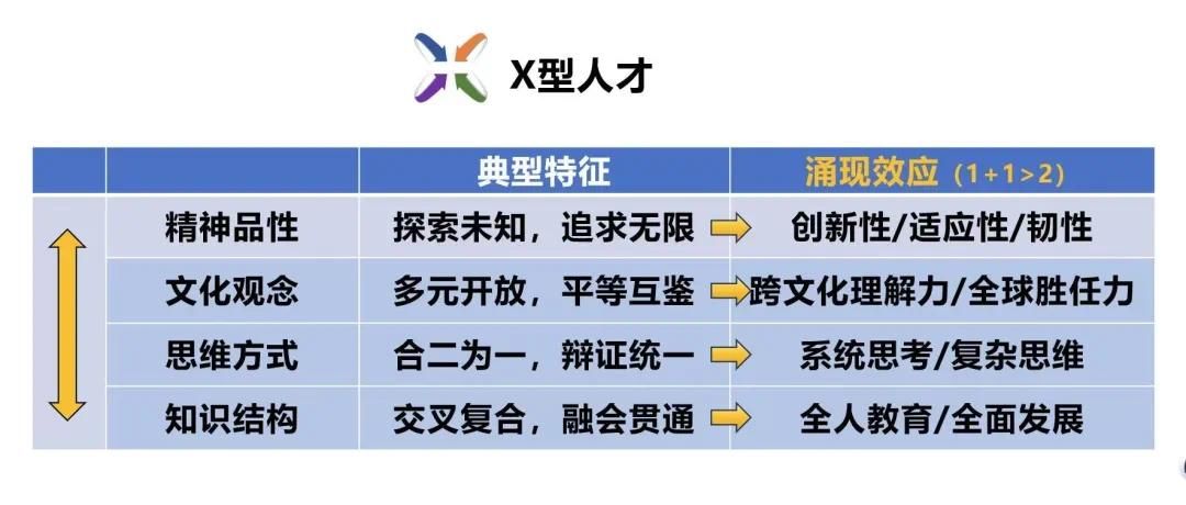 图片“X型”人才一般指能系统掌握两门专业知识,能够交叉融合、融会贯通,且能创造性解决问题的复合型人才。郑泉水院士曾撰文指出:X型学生(内驱、扬长/激光型)的特征是寻找激情/远大目标、全力以赴追求(舍得、长期主义),勇于探险,敢于失败,具有开放精神(好奇、自学、批判)。