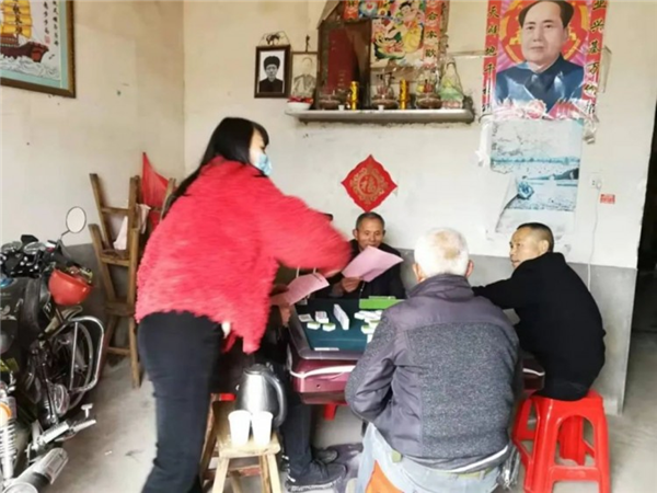 在进村入户中,看到不少村民在打牌、聚聊,王秋萍就冲上去劝疏。一开始,村民并不理解,“难得春节回家,大家都很久没见面,聊聊天没事”。王秋萍耐心地跟村民讲解防控知识,直到他们听懂。