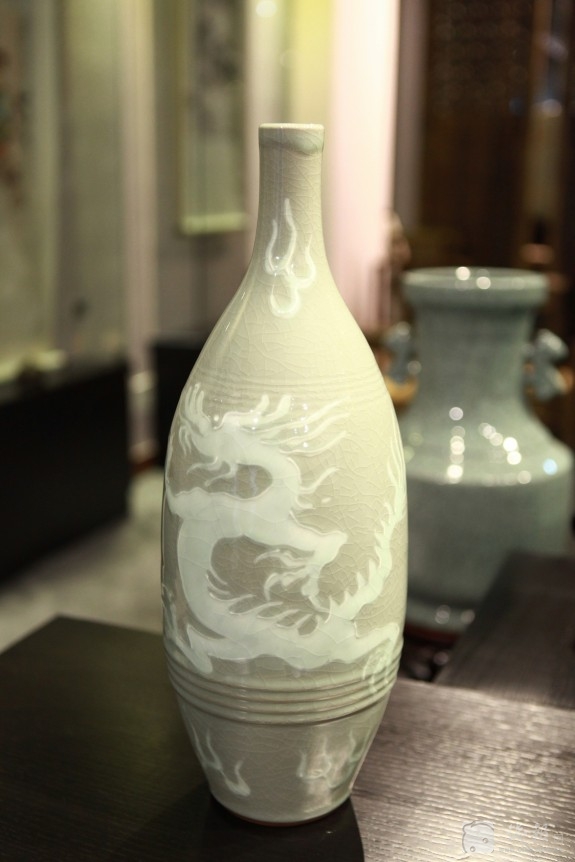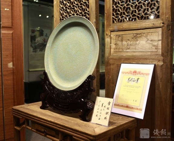 走进西湖文化广场32号门四楼西冷艺苑御富永藏405号“叶宏明古陶瓷工作室”,美仑美奂的名瓷令人叹为观止。这里展示的不仅有“夺得千峰翠色来”的龙泉青瓷,有“釉如美玉、色似碧波”的官窑作品。梅子青的弟窑牡丹刻花大盘、金丝银线文武开片的官窑挂盘,以及被北京中南海收藏陈列的“中南海紫光瓶”、陈列于中国历史博物馆的龙形开片小口瓶,更有青瓷堆花、哥弟结合红楼金钗画像瓶……真是美不胜收。
