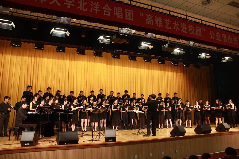 “高雅艺术进校园”北洋合唱团公益专场音乐会在张家窝中学举行。学生们用歌声肩负起推广高雅文化的使命,弘扬和传播合唱艺术,将艺术的精髓传递给在场的每一位听众。