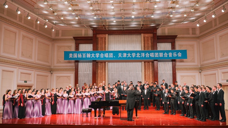“强音来袭”——北洋合唱团与杨百翰大学合唱团联合演出在天津音乐厅如期举行,两团唱响跨越国界的歌曲,在交流合作中碰撞出艺术的火花。