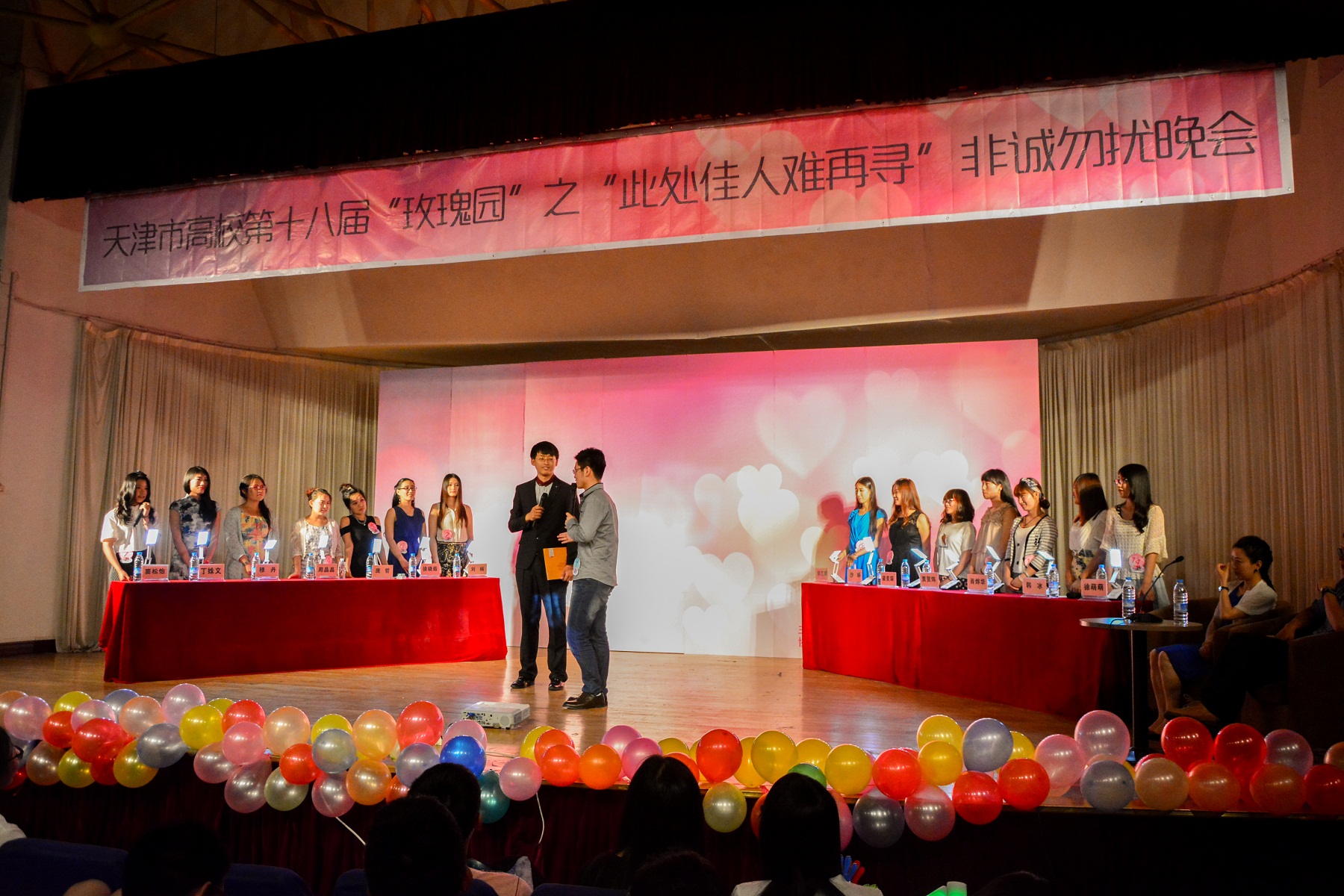 本站讯 (通讯员 冯天强)6月8日晚,天津市第十八届“玫瑰园”大型交友系列活动之校园版“非诚勿扰”晚会,在天津大学大学生活动中心成功举办。来自天津大学、南开大学、天津音乐学院等高校的14位女嘉宾和4位男嘉宾在现场开启了一场浪漫的爱情“双选会”。