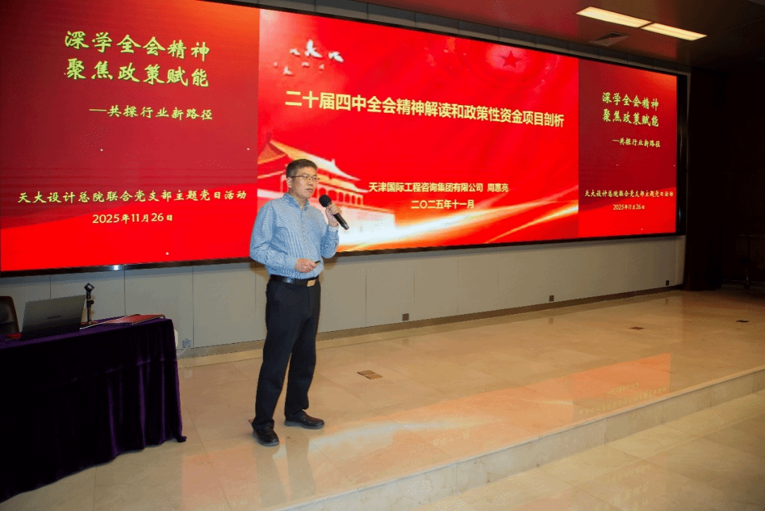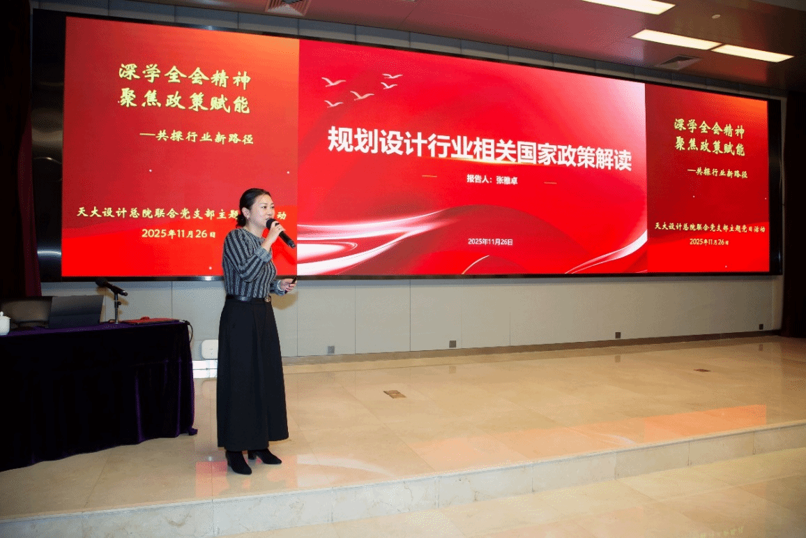 工作与业务发展深度融合,11月26日下午,天津大学建筑设计规划研究总院有限公司(以下简称“设计总院”)市政咨询等联合党支部在设计总院十楼报告厅举办“深学全会精神、聚焦政策赋能——共探行业新路径”主体党日活动。