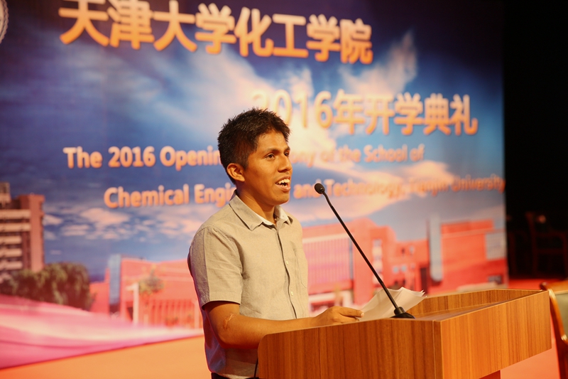 来自玻利维亚的约书亚作为留学生代表发言。约书亚认为,对于每一位国际学生来说,能从遥远的家乡来到天大化工读书不仅是一场很棒的学习体验,更是拓展专业技能的宝贵机会。“作为一名国际学生,我很高兴并庆幸能够在天津化工这个著名且优秀的平台继续我的学业,希望通过我们的共同努力,能够真正构建一个友好的、多元化的学习与文化环境,祝愿每一位同学都能刻苦努力、取得优异的成果。