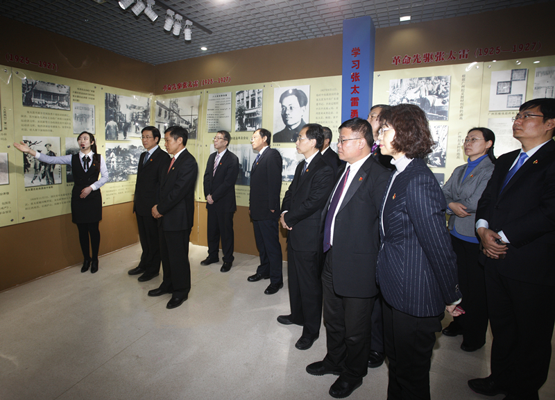 这间几十平米的纪念室布置独具匠心,展出了120余张珍贵的照片和一些珍贵的物品。走进张太雷纪念室,一幅幅图片把参观者带入到了百年前那个战乱频仍,有志青年为民族树理想、抛头颅洒热血的时代。在一张五四时期张太雷烈士投身运动参加北洋大学演讲团的画作前,新一届常委成员凝视良久,表情庄重。