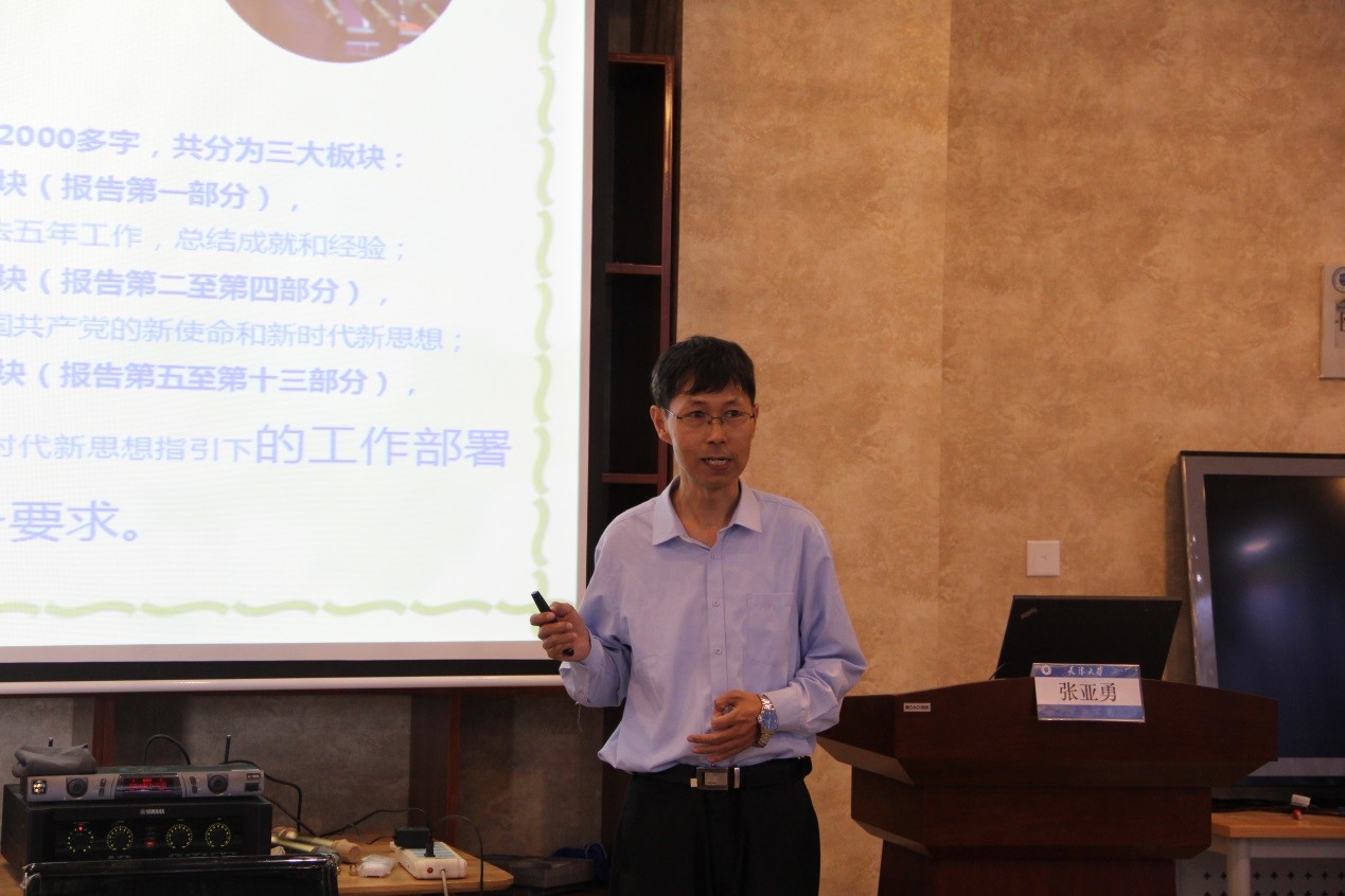 6月1日上午,全体与会成员围绕本次会议主题——完善“三全育人”思政工作体系进行了热烈研讨。大家认为,做好全员育人是实现习近平总书记“三全育人”要求的关键,要通过宣传教育使全体教职员工都具有育人意识,在各自岗位上发挥教书育人、管理育人、服务育人的作用,不仅注重知识文化的传授,更重视对学生思想道德品质的培养。然而,如何进行教师思政培训并使全过程育人更有章法尚有待进一步探索。6月1日下午,张亚勇教授做了题为“以新思想引领新时代”的专题报告。他以关键字变化为切入点,从新思想、新时代、新征程三个方面对党的十九大报告进行深入解读,并通过丰富的事例使大家强化认识,多次强调应“保持政治定力,坚持实干兴邦,始终坚持和发展中国特色社会主义”。除了与会代表,环境学院师生党员代表40余人聆听了报告,并就感兴趣的问题与张教授进行了深入交流。
