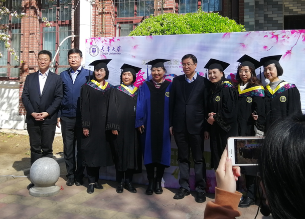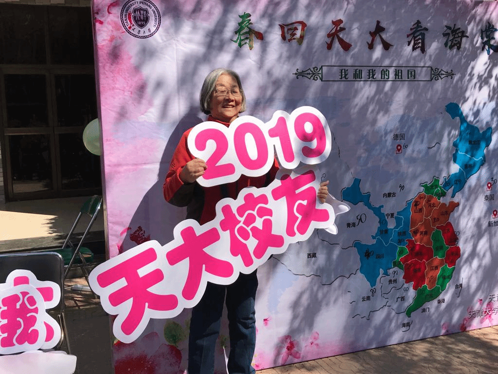 在铭德道第四教学楼前,校友总会组织了“春回天大看海棠”学士服合影活动,校友重温当年毕业的时刻。一位56级校友穿上学士服后非常激动,与学生志愿者交流“当年毕业没有学士服,这是自己第一次穿上”,并给学生讲述当年自己的求学故事,教育学生懂得感恩,珍惜来之不易的幸福生活,好好学习,回馈母校,报答祖国。
