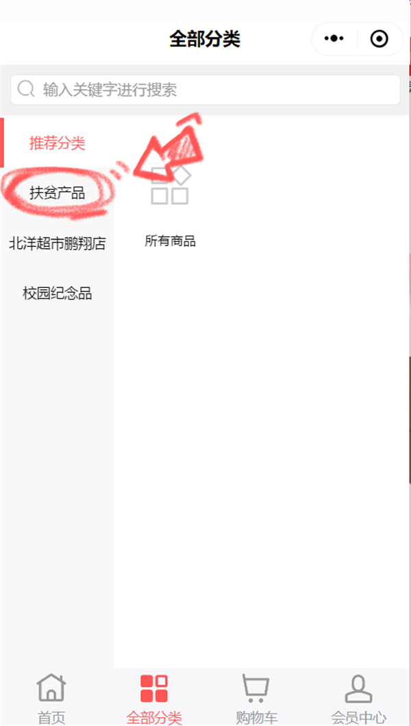 3.进入相应界面后,选择“扶贫产品”,显示产品分类。