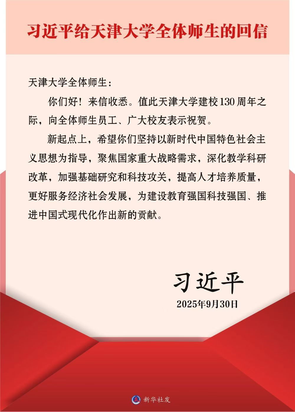 新华社北京10月2日电 近日,中共中央总书记、国家主席、中央军委主席习近平给天津大学全体师生回信,在天津大学建校130周年之际,向全体师生员工、广大校友表示祝贺。