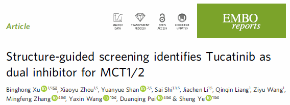 近日,天津大学医学部生命科学学院叶升/徐冰红课题组与西湖大学裴端卿课题组合作,在EMBO Reports杂志发表题为Structure-guided screening identifies Tucatinib as dual inhibitor for MCT1/2的研究论文。作者解析了MCT2-embigin在apo和抑制剂AR-C155858结合状态下的复合物结构,揭示了其调控底物转运的分子机制。基于结构进行药物库筛选,发现已上市药物Tucatinib能同时抑制MCT1和MCT2的转运功能,可有效阻断宫颈癌细胞的能量代谢,在实验和小鼠模型中显著抑制肿瘤生长与迁移,且安全性良好,为靶向肿瘤代谢疗法提供了新策略。