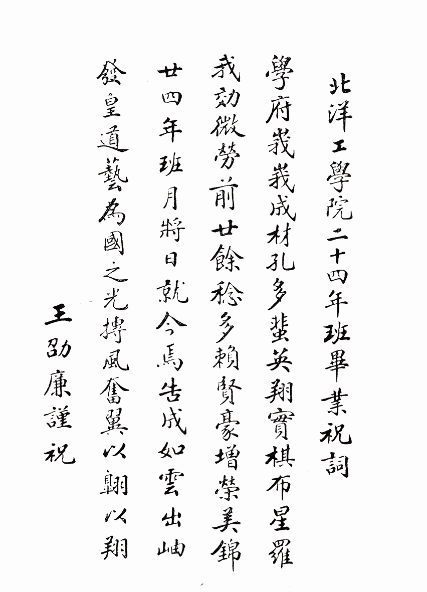 而对北洋大学作出重要贡献的王劭廉则希望同学们:“今焉告成,如云出岫;发皇道艺,为国之光;抟风奋击,以翱以翔。”
