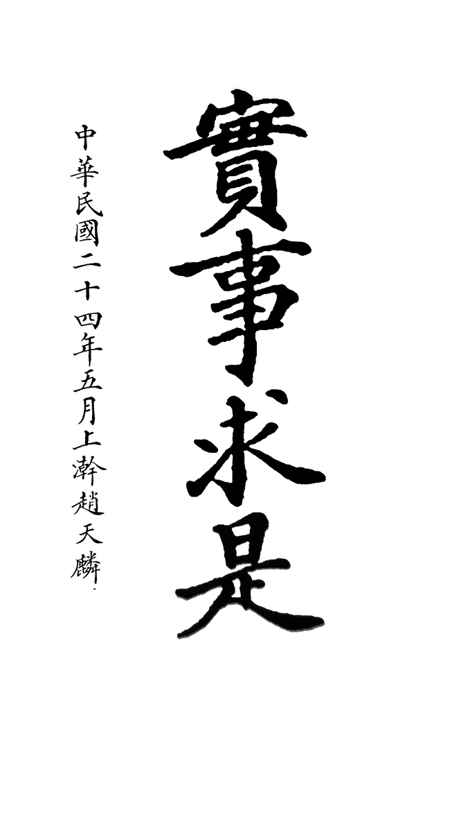 在1935届学生的毕业纪念册里,原校长赵天麟寄语这届学生:“‘实事求是’、永作羹樯……愿本校训,互助勿忘”;而他的继任者冯熙运校长也结合当时抗日战争的“国难”,谆谆告知学生:“学无止境,唯力在行;覃思孟晋,业必益精;国难方殷,共作建设;‘实事求是’,毋改故辙……”