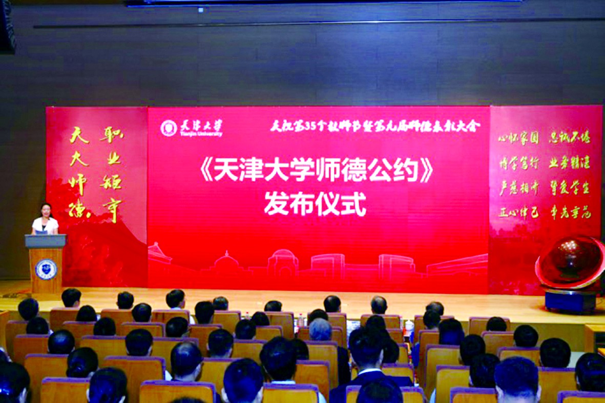 凝练新时代师德标准。学校在全校范围内开展“师德大讨论”教育活动,面向基层广泛征询新时代师德标准及意见,经校内外专家反复论证,凝练形成《天津大学师德公约》。作为新时代天津大学师德文化符号,该《公约》在庆祝第35个教师节大会上隆重发布,旨在引导教师真正做到以德立身、以德立学、以德施教。