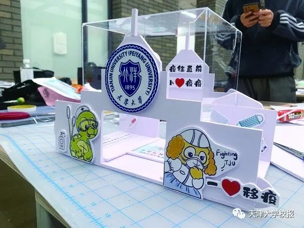 自制扫码神器 ——1月20日,在卫津路校区检测现场,扫码不冻手的扫码神器成为当天大筛登记台上“最靓的仔”。这个由医学部和建筑学院联合研制的扫码神器外型是一个微缩版的天大卫津路校区东门,上面有建筑学院学生手绘的“万众一心,助力战疫”的宣传漫画,顶部是有机玻璃材料。使用时,志愿者把手机调试到扫码界面,放置在“东门”顶上,登记的同学把身份证头像向上放置在东门里,轻轻一点即完成登记,大大减轻了户外冻手感。这款扫码神器在老校区的20个检测通道各放了一台。