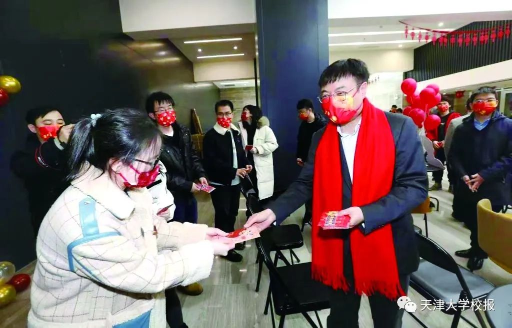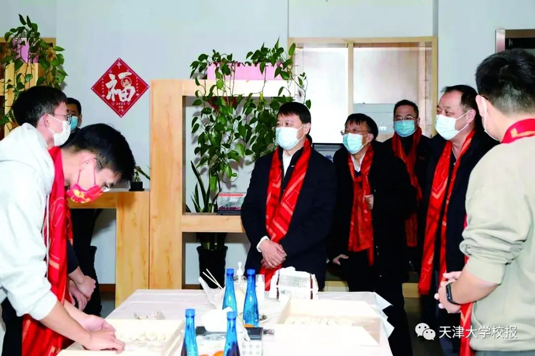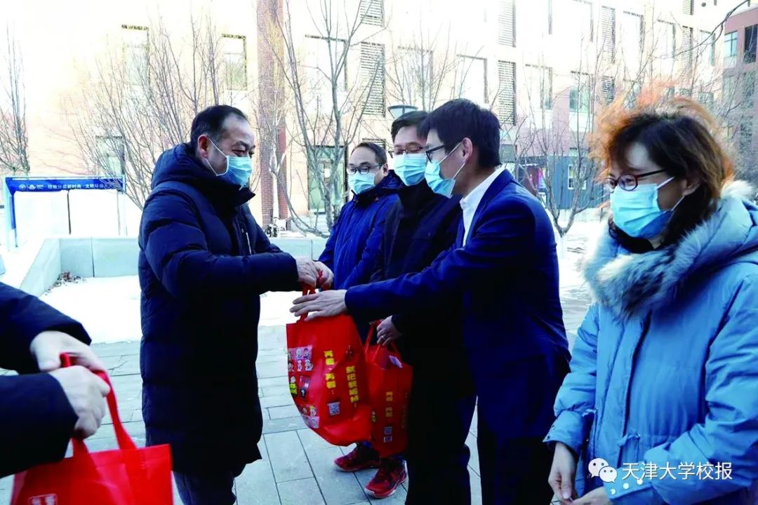 除夕当天,在北洋园校区,校领导杨贤金、张凤宝、谭欣、贾启君来到理学院、校医院、保卫处、后保部、智算学部和图书馆等单位,向坚守工作岗位的教职员工拜年。在卫津路校区,金东寒、王树新、元英进、曲凯、郑刚、张力新、刘宁等校领导走访慰问了部分学院(部)留校师生,给大家发放新春大礼包、与家长连线拜年、和同学们一起写春联贴福字、发年货包饺子……前一天,郑刚代表学校领导与国教学院师生举行了午餐会,向来自10余个国家的留学生代表致以新春佳节的祝福。