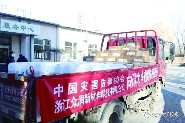 1月17日,天津大学在校门口接收了一批防疫物资,中国灾害防御协会向我校捐赠了一批消毒液、消毒喷剂和消毒水巾。