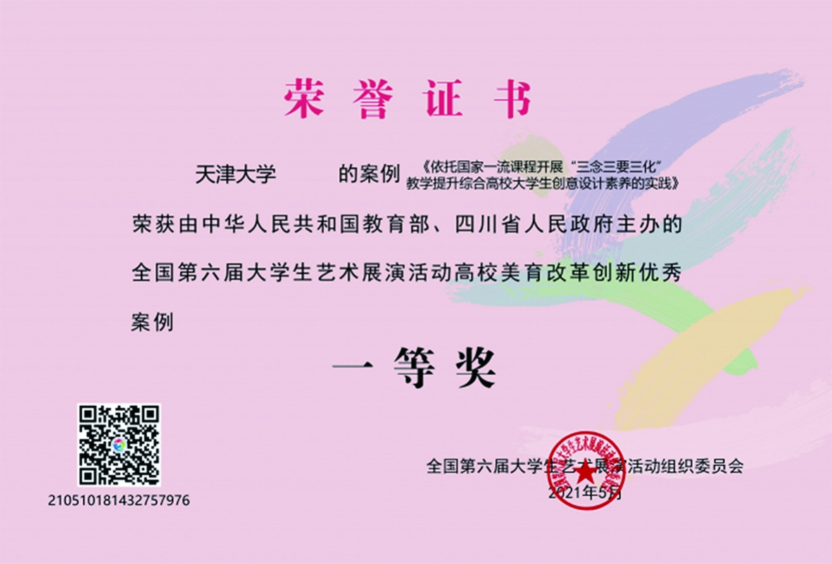 导言 2021年5月,在教育部主办的全国第六届大学生艺术展演活动中,全国198所高校的264支代表队参加角逐。天大建筑学院的王鹤老师的美育创新案例《依托国家一流课程开展“三念三要三化”教学提升—— 综合高校大学生创意设计素养的实践》在全国评选中获得一等奖。