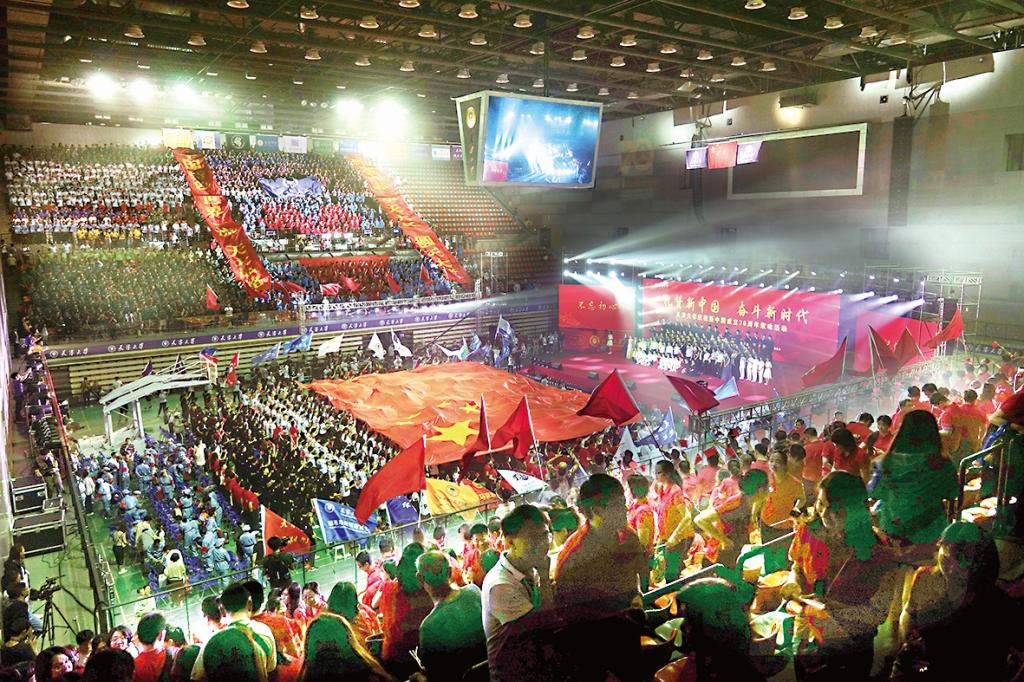 9月27日,天津大学卫津路校区体育馆欢乐与激情交织成海洋。“礼赞新中国 奋斗新时代”天津大学庆祝中华人民共和国成立70周年歌咏大会在这里隆重举行。4000余名天大师生齐聚一堂,共同演绎丰富多彩的文艺节目,为新中国成立70周年放声歌唱,献礼祖国母亲,抒写北洋情怀。