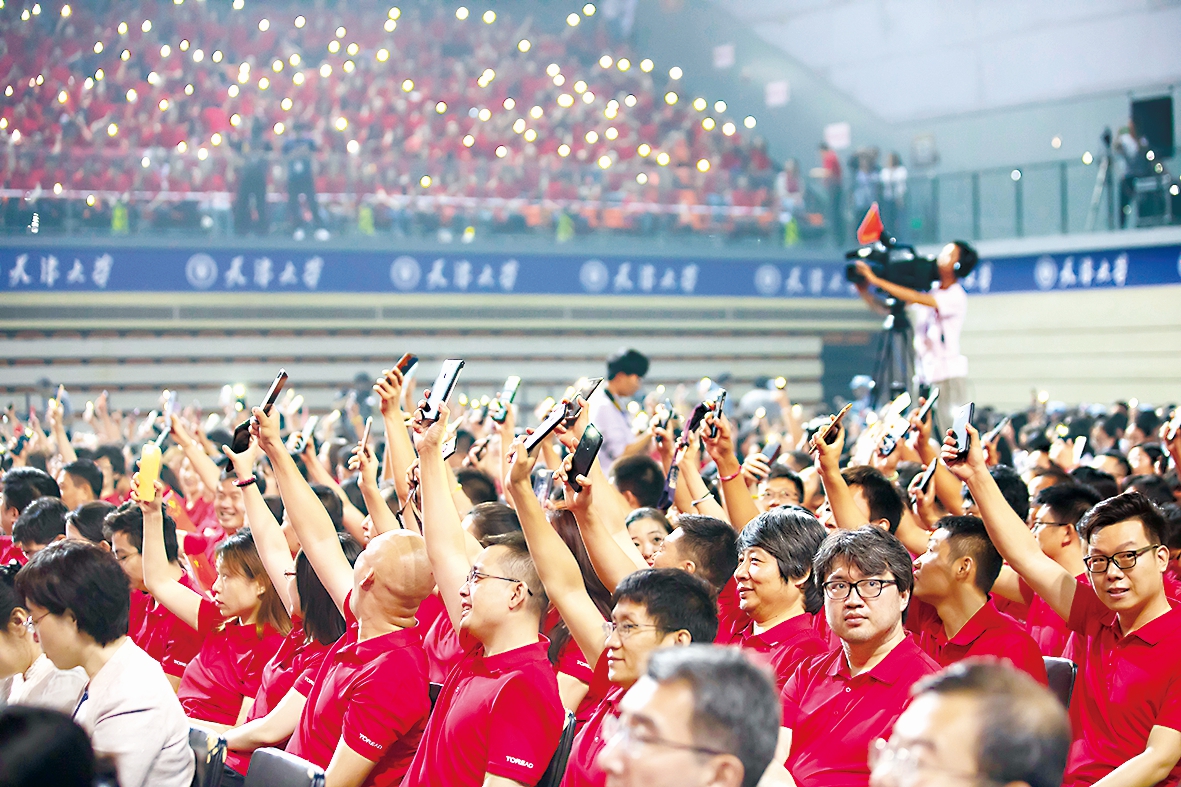 全场起立,在巨型国旗和巨型条幅的映衬下,师生共同合唱《我和我的祖国》和《天津大学校歌》,祝伟大祖国繁荣昌盛,祝天津大学蒸蒸日上。