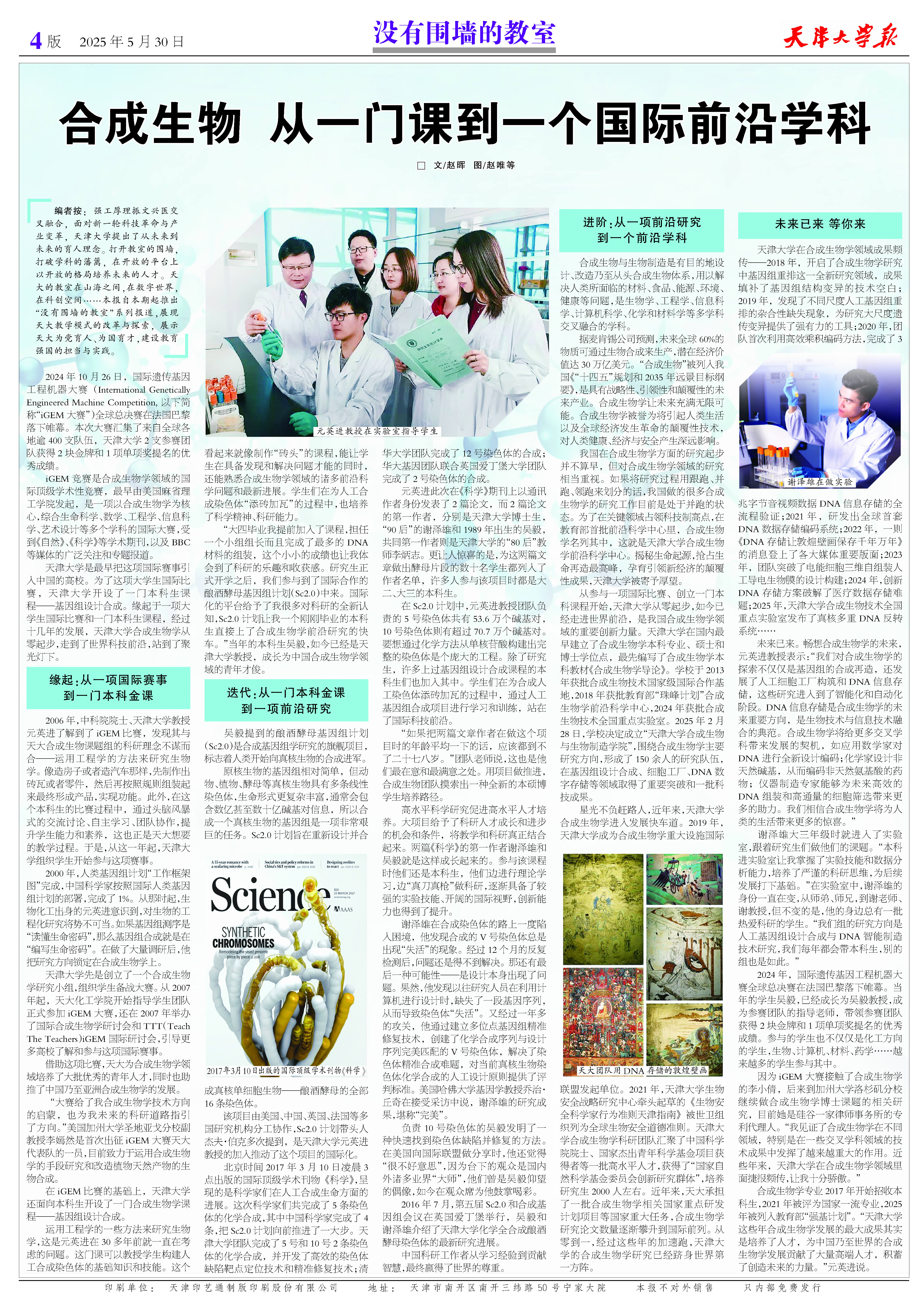 从参与一项国际比赛、创立一门本科课程开始,天津大学从零起步,如今已经走进世界前沿,是我国合成生物学领域的重要创新力量。天津大学在国内最早建立了合成生物学本科专业、硕士和博士学位点,最先编写了合成生物学本科教材《合成生物学导论》。学校于2013年获批合成生物技术国家级国际合作基地,2018年获批教育部“珠峰计划”合成生物学前沿科学中心,2024年获批合成生物技术全国重点实验室。2025年2月28日,学校决定成立“天津大学合成生物与生物制造学院”,围绕合成生物学主要研究方向,形成了150余人的研究队伍,在基因组设计合成、细胞工厂、DNA数字存储等领域取得了重要突破和一批科技成果。