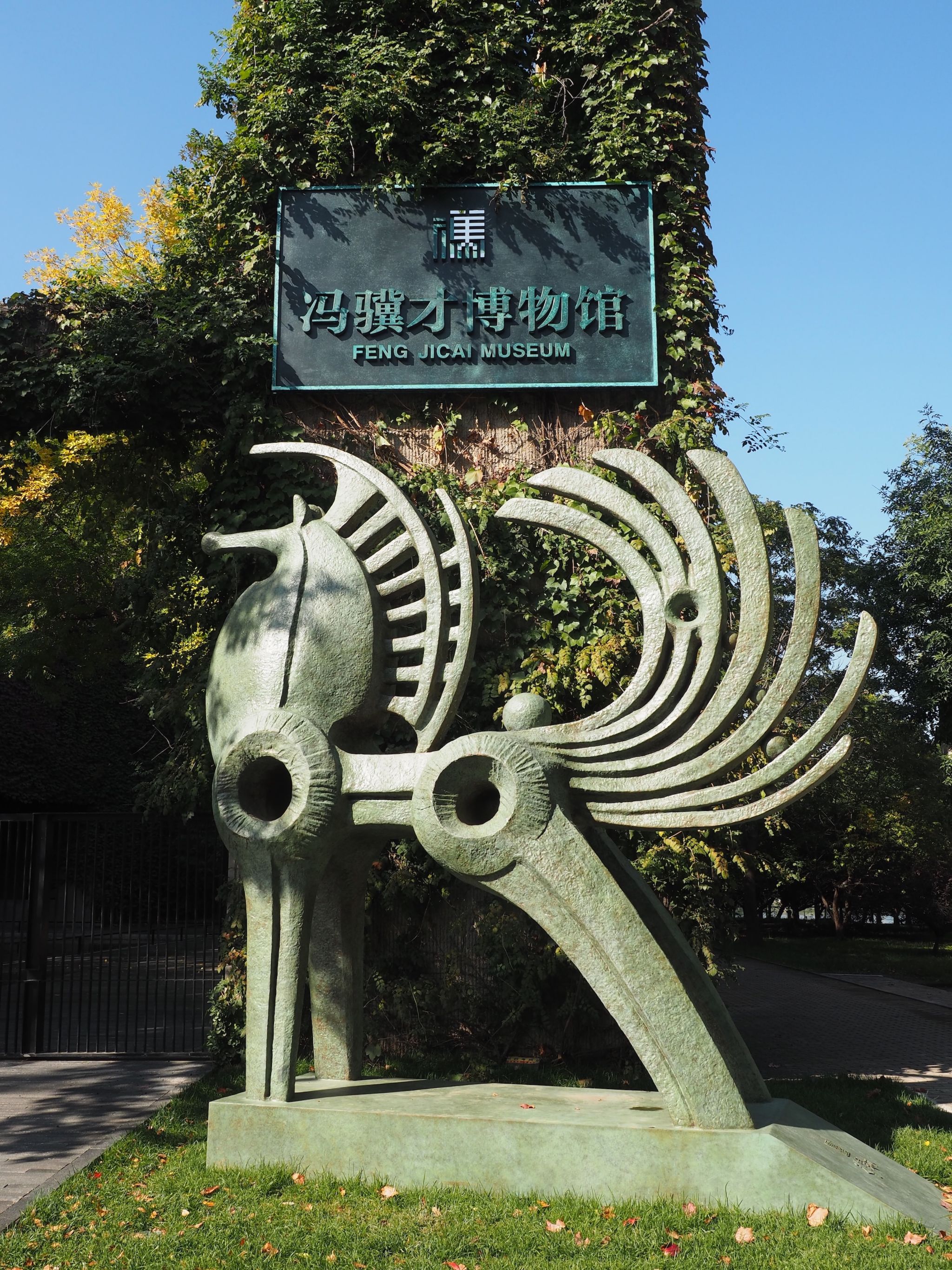 踏入庭院,你将立刻被美拥抱。韩美林先生的三吨重铜铸《天马》正昂首振鬣,鬃毛仿佛要被风掀起,铜色的肌理在阳光下泛着软乎乎的光;陈云岗的《老子》凝立着,衣袂飘飘,藏着哲人的沉静;吴为山的《李白》踮着脚似的,要去碰天上的月亮,满身都是诗仙的飘逸;商长虹塑的徐志摩眉眼弯弯,长衫轻扬,带着中国文人的柔情与傲骨;冯骥才先生笔下的《神鞭》,经刘军塑出筋骨,在青铜上绷得紧紧的……这些雕塑和院里的景致凑成了一幅活的画:全国高校最大的红叶墙,在秋风里燃成一片深红的火,叶片边缘镶着金边,风一吹,“簌簌”吟唱;澄心池里的锦鲤,拖着尾巴拨弄飘落的黄叶,水波一圈圈荡开,把阳光揉成细碎的金片;天鹅交颈时的温柔,竹林摇晃的轻响,石径旁野草淡淡的香,缠在一起,成了秋日里最软的交响。