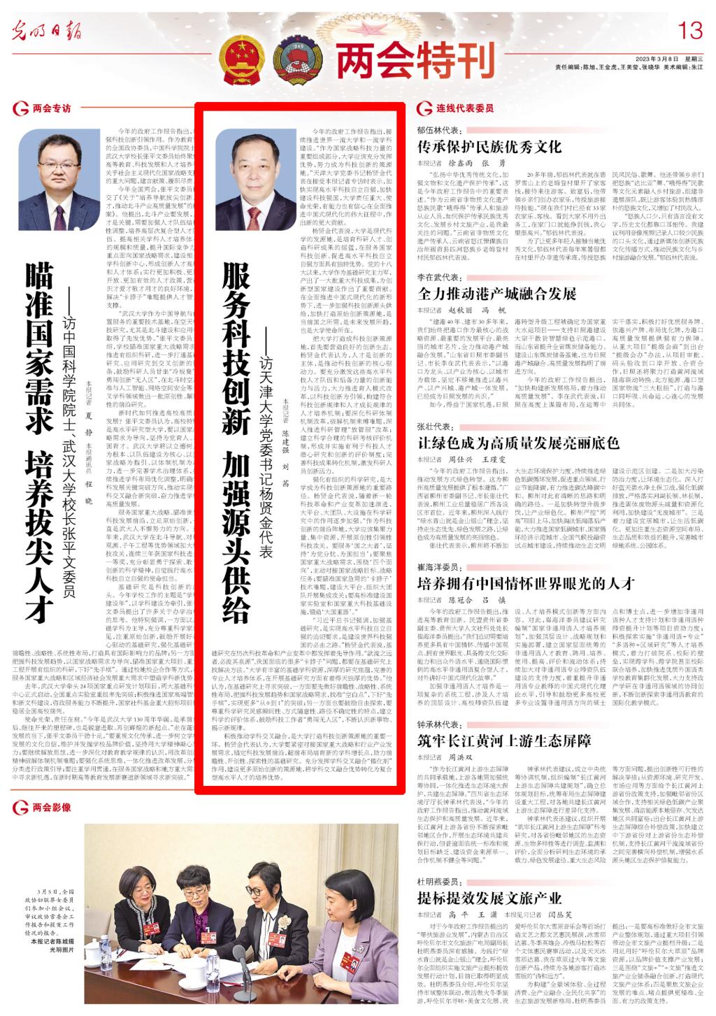 今年的政府工作报告指出,接续推进世界一流大学和一流学科建设。“作为国家战略科技力量的重要组成部分,大学应该充分发挥优势,努力成为科技创新的策源地。”天津大学党委书记杨贤金代表在接受本报记者专访时表示,加快实现高水平科技自立自强,加快建设科技强国,大学责任重大、使命光荣,有能力也有信心在全面推进中国式现代化的伟大征程中,作出新的更大贡献。