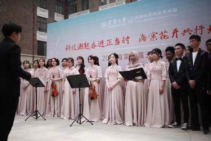 当天,友谊湖畔重装一新的“校友之家”正式对外开放;来自耀华中学、新华中学、南开中学、山东省庆云一中的近300名中学生走进天大校园感受大学之美;来自校内各社团别开多样的精彩表演、来自19个国家的留学生组成的中文合唱团载歌载舞、由天津大学附属小学北洋童声合唱团带来天籁之音……与此同时,为了让更多市民能欣赏到天大一年一度的海棠之美,天津大学还在官方微博、视频号、抖音、B站等平台同步进行“天大·海棠季”专场直播,开启“云赏花”。
