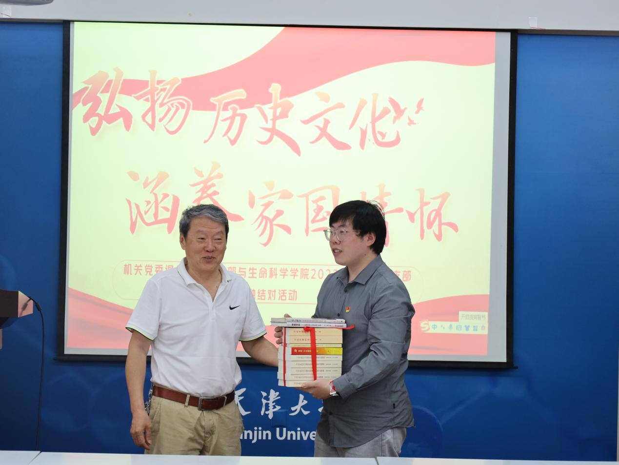 活动最后,退休党支部各位老师向学生党支部成员赠送党史、校史的相关书籍,并勉励青年党员要树立远大理想,勇于砥砺奋斗,在生命科学领域深耕钻研,努力成长为担当民族复兴大任的时代新人。