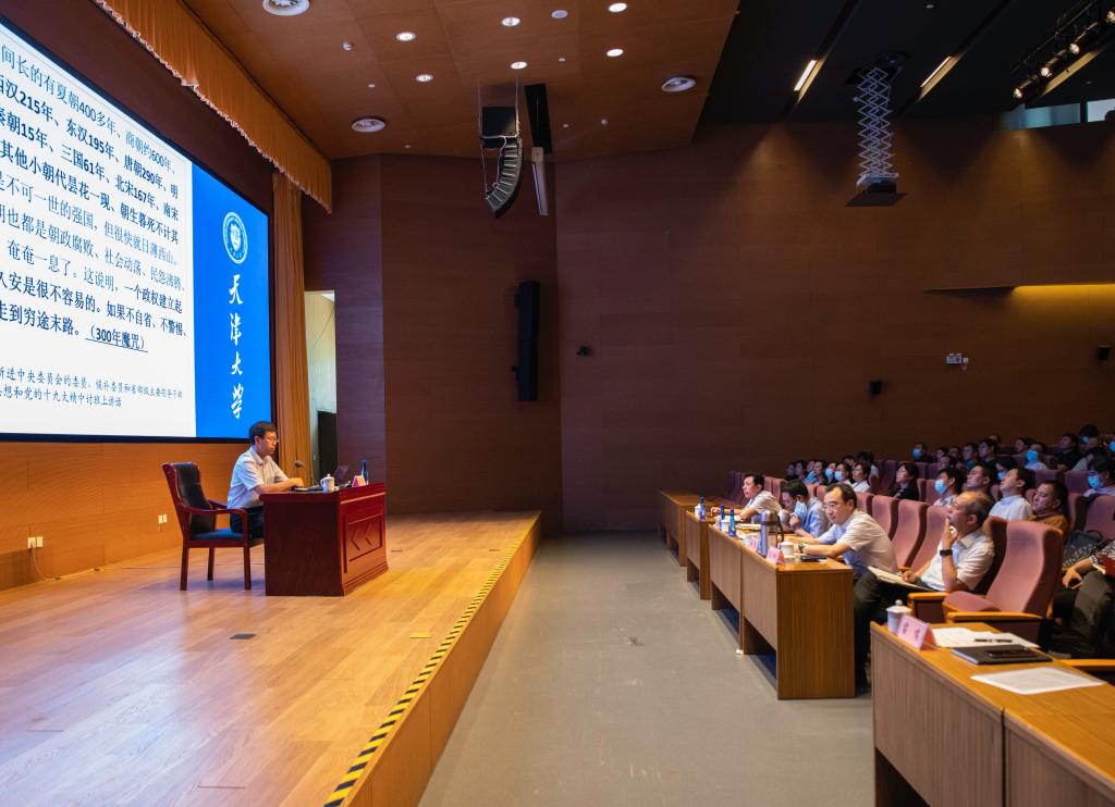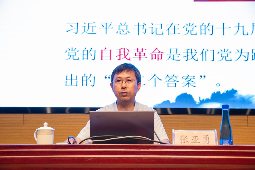 (通讯员 温锌勇 摄影刘志丹)为进一步引导广大党员干部深刻理解全面从严治党的重大意义,增强坚定理想信念、严守纪律规矩、锤炼过硬作风的自觉性,6月2日下午,我校举办学习贯彻习近平新时代中国特色社会主义思想主题教育读书班,天津市委党校张亚勇教授作了题为“坚定不移全面从严治党,以自我革命引领伟大社会革命”的理论辅导报告。校、院两级党委理论学习中心组成员参加报告会,会议由校党委副书记雷鸣主持。