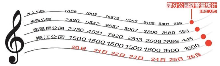 记者从市城市管理委了解到,3月20日至26日,水上公园、水西公园、南翠屏公园、梅江公园这四座城市公园的游客量合计为108207。(梅江公园为开放式公园,无法进行精确游客量计算,估算每日游客量为1500人次左右。)