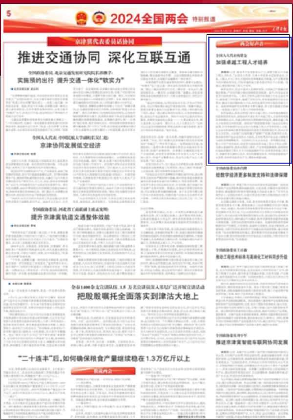 本报讯(记者 张立平)“发展新质生产力,需要不断壮大卓越工程人才队伍。”全国人大代表、天津大学党委书记杨贤金说,目前,工程人才与工学人才趋同化培养现象较为普遍,与产业需求脱节的问题依然突出,对标卓越的能力素养要求尚有不小距离。他建议,要加强卓越工程人才培养。