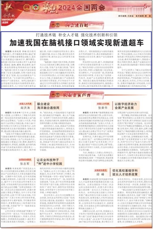 本报讯(记者史莺 李杨)因为使用了脑机接口,多年瘫痪患者得以通过“意念”驱动可穿戴设备重塑运动能力,甚至可以直接通过大脑来打字、操作微信。脑机接口技术如今还被应用于儿童多动症、孤独症、脑瘫、癫痫、帕金森病、脑卒中、难治性抑郁症等疾病的治疗康复中。“脑机接口技术为大脑与外部设备间搭建了信息交流通路,实现大脑状态监测及‘意念’控制,是公认的新质生产力的典型代表。”正在进行的全国两会上,新质生产力备受关注。如何让脑机接口这项造福百姓的技术发展得更快更好,全国政协委员、九三学社天津市委员会副主委、天津大学副校长明东表示,要从打通技术链、补全人才链,强化相关技术创新和引领,面向社会公众科普等方面夯实基础。