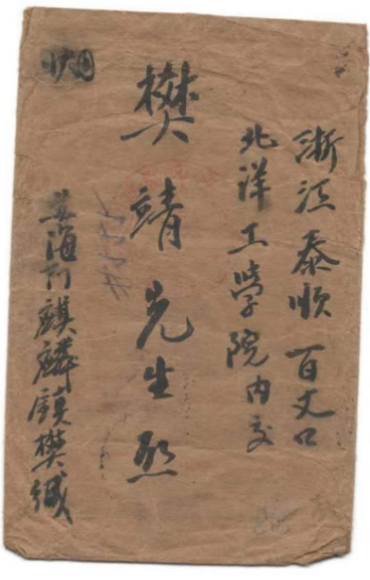 泰顺办学岁月虽历经战乱动荡,颠沛流离,但由于师生的共同努力,仍在艰苦条件下逐步发展,在此办学期间共录取新生近400人。而信封的主人翁樊靖,年仅二十岁时告别父母,离开家乡江苏省海门县麒麟镇,历经长途跋涉,一路翻山越岭,来到百丈求学,就读于机电工程学系。