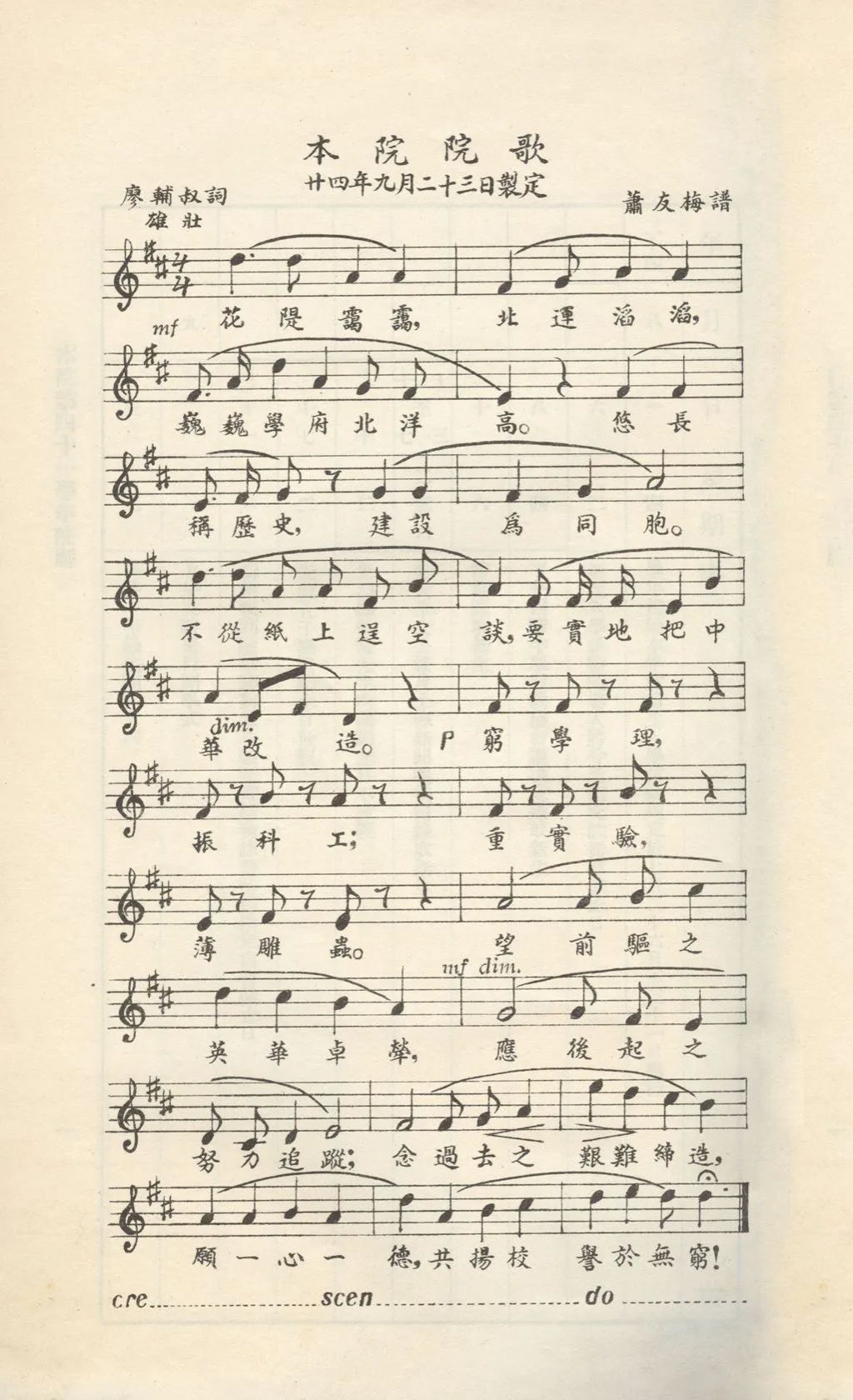 1935年第74期《北洋周刊》刊登了“本院院歌”:“本院前恳上海国立音乐专科学校校长萧友梅先生转托音乐艺文社社员廖辅叔君代撰院歌,俾便集会时歌咏。”歌词现已寄院,披露如下: