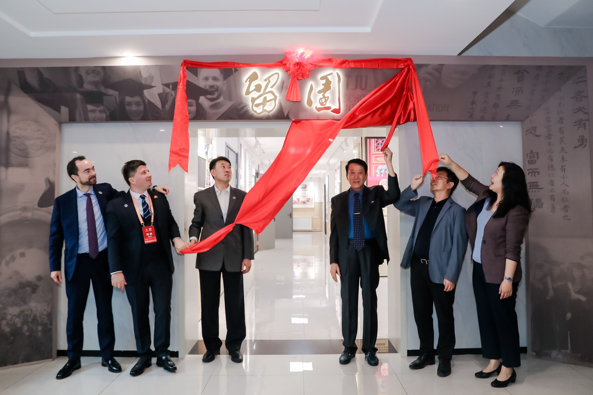 校庆当日,国际教育学院院史馆举行揭牌仪式。院史馆内系统设置了学院概况、发展历程、人才培养、支持服务体系、中文教学、学科建设等主题展区,完整呈现了国际教育学院的发展脉络与育人成果。揭牌仪式后,金旋为校友和来宾讲解院史并陪同参观,现场气氛温馨而热烈。