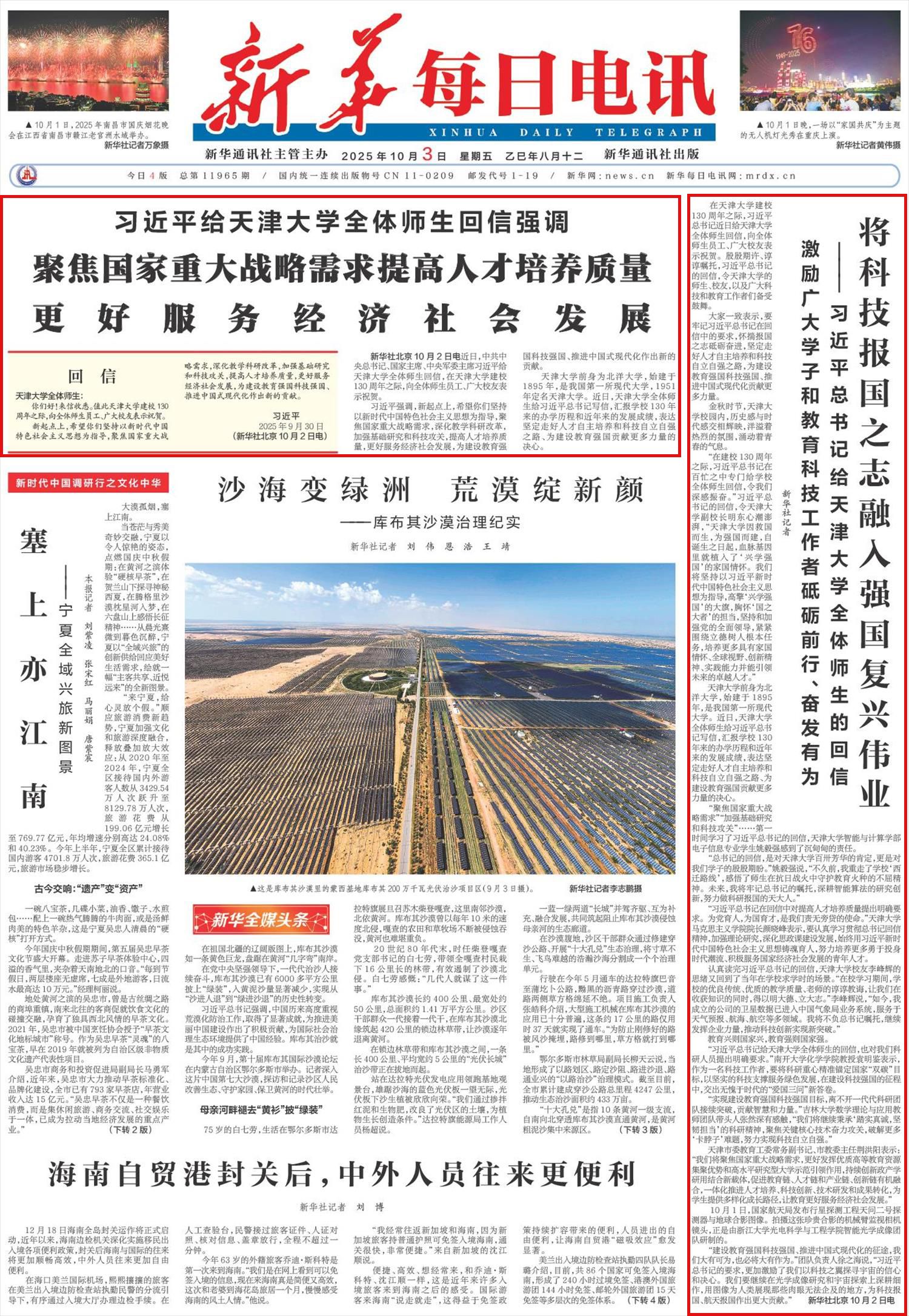 新华社北京10月2日电近日,中共中央总书记、国家主席、中央军委主席习近平给天津大学全体师生回信,在天津大学建校130周年之际,向全体师生员工、广大校友表示祝贺。