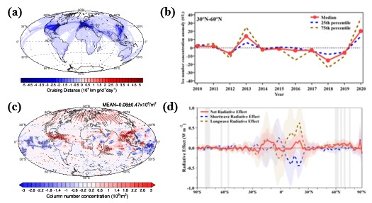 图1(a)2020年4-5月全球飞机里程数与2019年同期偏差(b)卫星观测2010-2020年北纬30°~60°区域冰云冰晶数浓度变化(c)飞机碳气溶胶排放减少导致全球冰云冰晶数浓度变化数值模拟(d)飞机碳气溶胶排放减少产生的冰云辐射效应