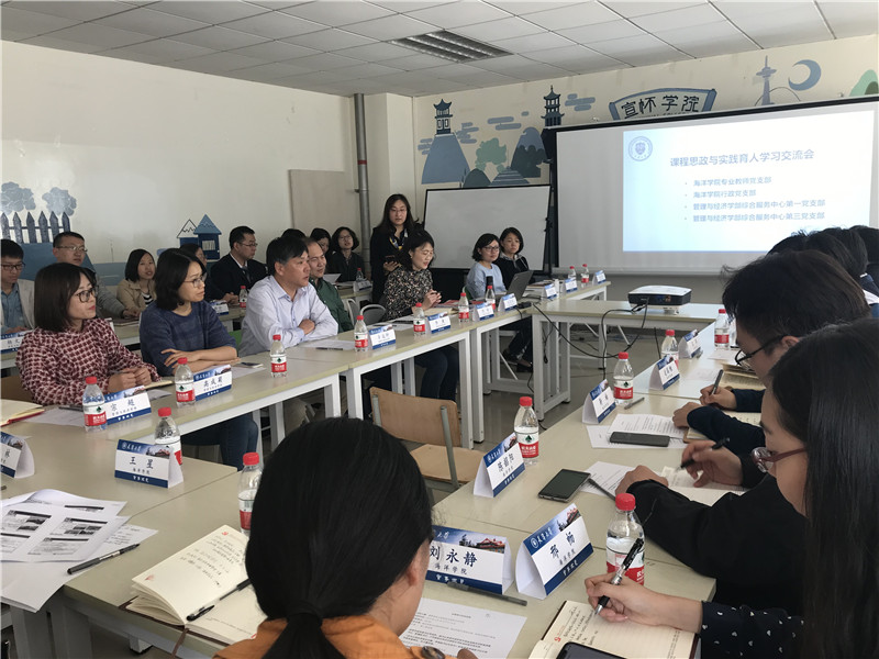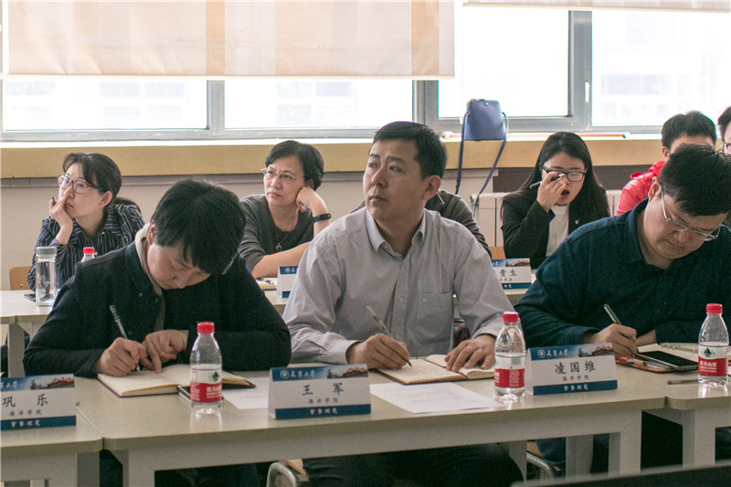 工作等进行了深入的交流。海洋学院魏皓教授、张学峰教授,青年教师薛彬、常帅等,从自己所承担的课程出发,介绍了自己如何将“思政”融入到课程教学中的心得体会。经管学部岳晋萍、高成菊等老师们就对课程思政改革的理解、思政教育与专业课程内容的融合、求实务真精神和敬业精神在专业课程中的融入,引导学生端正思想、扎实理论、帮助学生树立正确的人生观、价值观、世界观,对如何把看似枯燥、难以理解的专业知识变得生动、有活力、有魅力等方面展开了热烈的讨论。