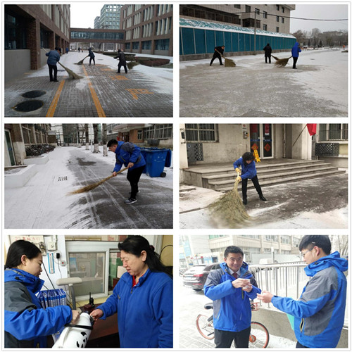 12日清晨,迎来首场降雪,纷纷扬扬。全体物业人员迅速行动,顶风冒雪,对学校各楼宇及学生公寓的台阶、门口、周边及主干道上的积雪进行清扫,保证道路畅通无阻;在楼宇和学生公寓的门口铺设防滑地垫、摆放防滑标牌,同时安排门值员和宿管员提醒来往师生注意出行安全;对25楼、26楼、会议楼的地库出入口处及时进行清扫,确保车辆出入地库的行驶安全。