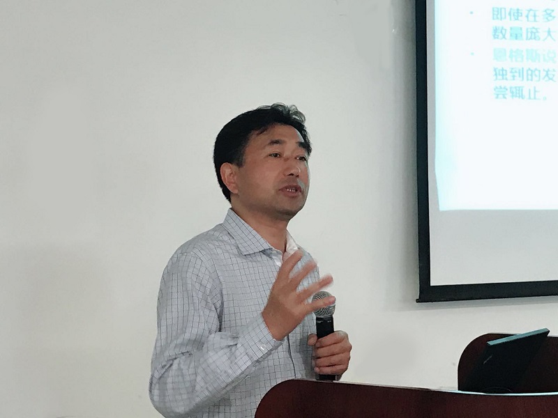 在主题分享环节,党委书记花建锋向与会师生传达习近平总书记在北大座谈会以及在纪念马克思诞辰200周年纪念大会上的讲话精神。他对两次讲话的原文进行了充分的解读,并从信其言与信其行、信其言与知其言、信其言与践其言三个方面鼓励广大学生党员学习马克思的品质,学习马克思主义理论的品质,勉励大家将马克思主义理论与日常学习生活相结合,努力做到“爱国、励志、求真、力行”。