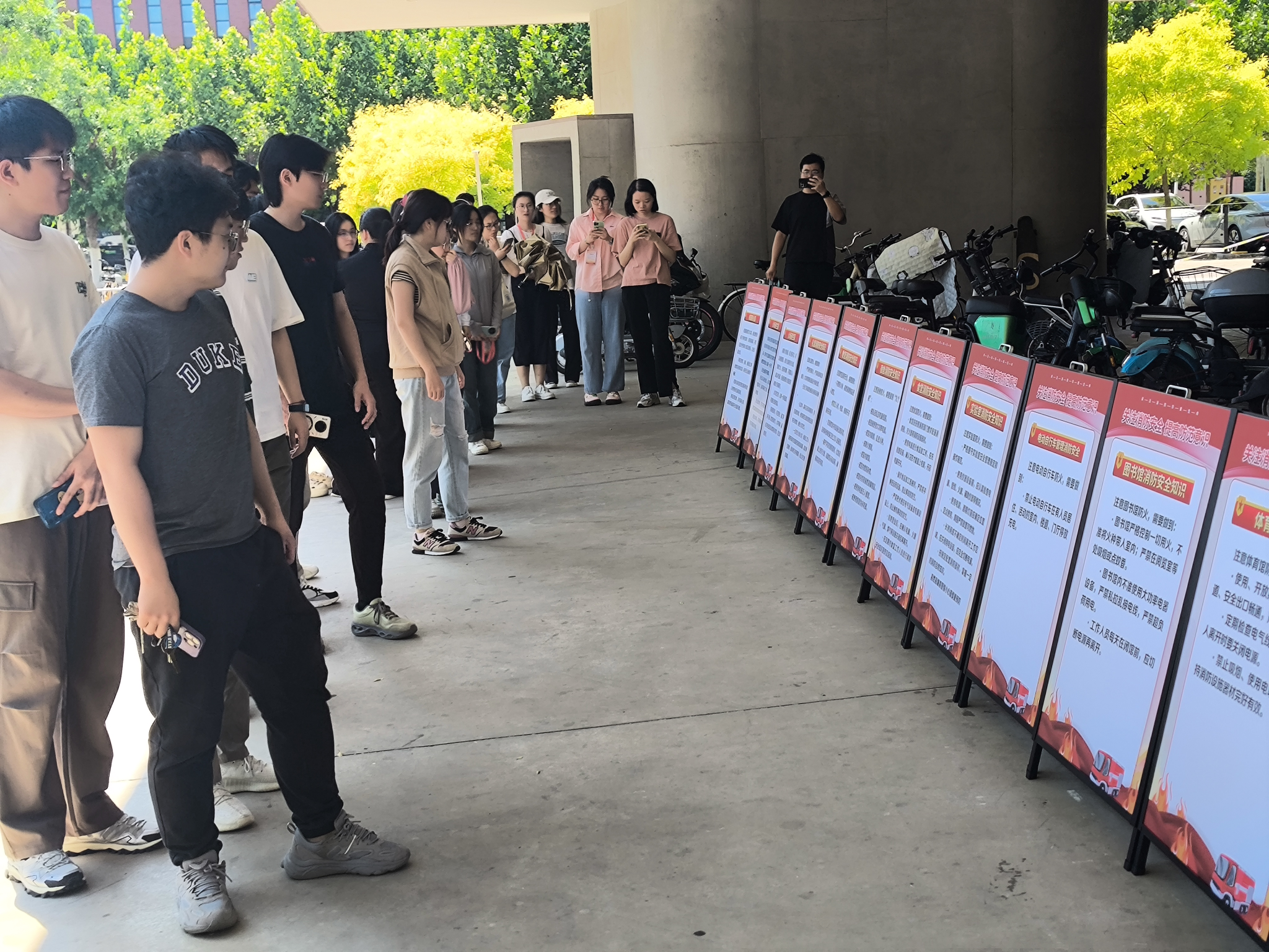 疏散演习后,在双校区六个户外避险地点,学校预先准备“关注消防、珍爱生命”消防安全系列展板,以及“防范电信网络诈骗”财产安全系列展板,通过面向学生开展多类型安全主题教育,进一步传播消防安全和财产安全的常识。