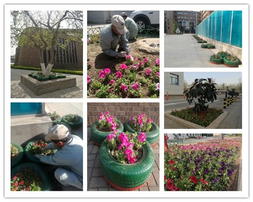室外园林绿化,结合卫津路校区内土壤肥沃程度、夏季阳光照射情况等综合因素,物业制定了绿化提升专项工作计划。物业选择在科学图书馆北侧孔子像处播撒矮杆向日葵花籽。孔子像对面空地靠近路边较引人注目,就栽种红色、粉色雏菊,紫色、粉色、红色矮牵牛花,吸引众人驻足观赏。考虑到第26教学楼A区北侧、B区南侧、C区北侧,以及地下车库入口处比较空旷,地面为面包砖,不宜栽种花卉,就彩刷了大量轮胎,并在轮胎内栽种多色雏菊及矮牵牛花,在上述区域进行摆放,给教学楼室外环境增添色彩。物业将第26教学楼B区西侧改造成微景观——“月季园”,把此区域按照三七比例分配,前排栽种芍药,后面栽种大面积月季。第26教学楼C区前广场、大松树处及联合大厦花箱处,仍作为微景观观赏区,栽种不同花卉和一些耐生长的阔叶植物。