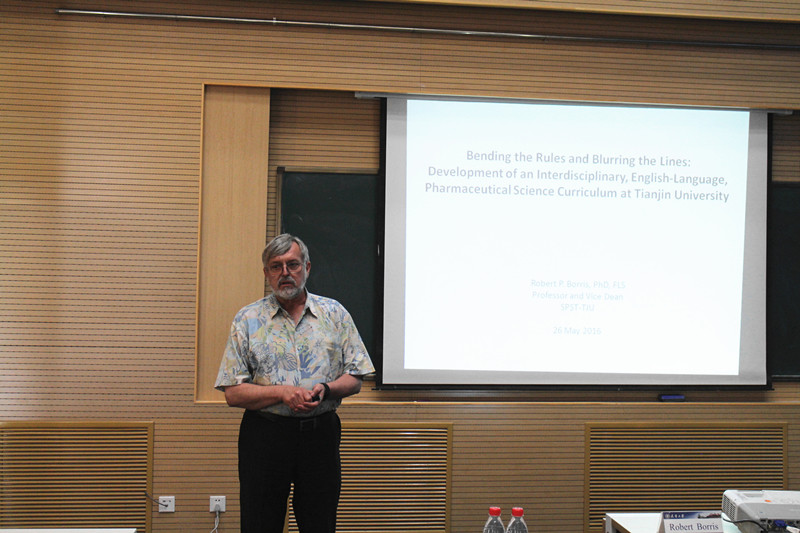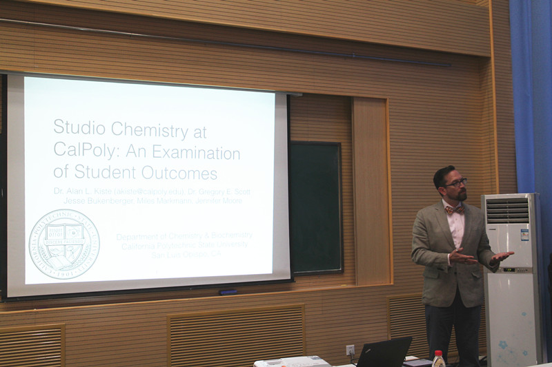 之后,教学研讨工作坊在24教学楼408会议室召开。此次教学工作坊特邀美国密歇根大学Brian P. Coppola教授、美国加利福尼亚职业技术大学Alan L. Kiste副教授、单小麟以及天津大学药学院Robert Borris教授分别结合所在领域做教学主题报告。首先报告的Robert Borris教授,全职进入天津大学药学院近2年,主要负责教学改革建设。他立足天大药学院,畅谈如何打破束缚、构建跨学科全英文药学培养方案。Alan L. Kiste副教授以该校尝试的lecture/laboratory (studio) 教学方式及学生学习效果为主题,为到场听众做了精彩报告。作为我校实践创新型人才培养试点的求是学部,致力于推进工程教育改革,探索拔尖工程创新人才培养模式。单小麟分享了求是学部在创新人才培养方面的经验以及心得。最后带来报告的是来自密歇根大学的Brian P. Coppola教授,他用近一个小时的时间详细讲解了如何从实际工作的需求出发,设计教学环节、培养创新人才。