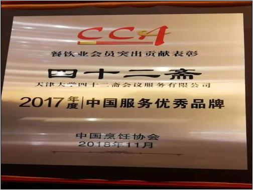 本站讯(通讯员 古燕)2018年11月18日,由中国烹饪协会举办的2017年度全国餐饮行业“中国服务”系列评选活动在人民大会堂隆重举行。天津大学四十二斋会议服务有限公司(天津大学会议接待中心)被评选为 “2017年度中国服务优秀品牌”,天津大学42斋是全国高校宾馆中第一家获此殊荣的企业。