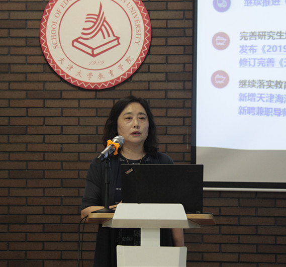 、师资队伍建设、国际与地区合作与交流、管理与服务方面等方面汇报了2018-2019年的学院工作,随后就2018年度学院财务收支情况作了汇报。最后她代表学院向全体教职工的辛勤工作表示感谢,同时指出新时代学院进入转型、改革、发展的关键期,挑战与机遇并存,2019年,需要大家凝心聚力,攻坚克难,为早日建成特色鲜明、国内一流、具有较强国际影响力的教育学院而努力奋斗,以优异的成绩向中华人民共和国成立70周年献礼!