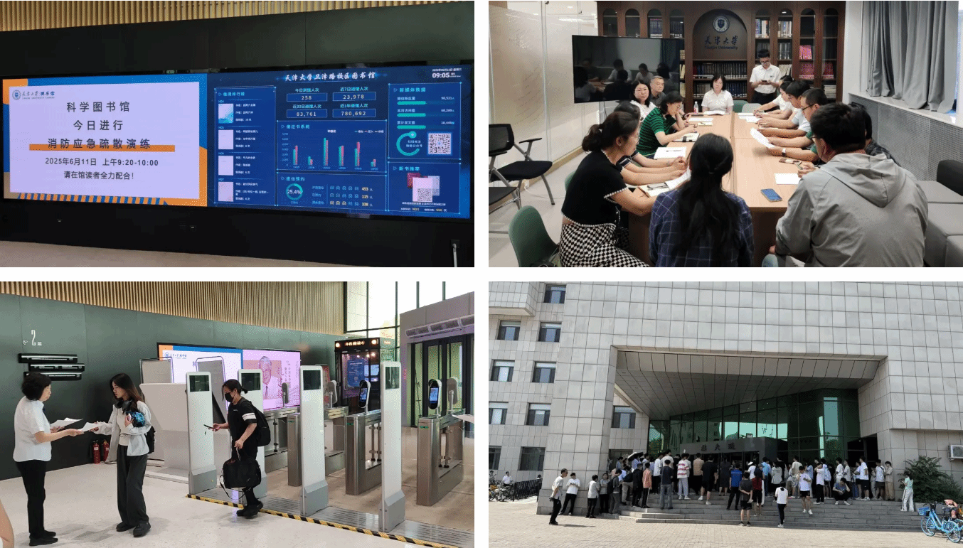 本站讯(通讯员 李婉君 倪潇)为深入贯彻落实国务院安委会办公室和应急管理部关于第二十三个全国“安全生产月”的部署要求,落实校领导关于安全生产工作的指示精神,切实提升图书馆消防安全保障能力,6月11日上午,天津大学图书馆联合保卫处、学工部、后保部等多部门,在卫津路校区科学图书馆组织开展了一场实战化消防应急疏散演练。图书馆班子成员、保卫处副处长刘东海、学工部副部长王作金、后保部物业服务管理负责人、图书馆馆员、物业人员及在馆读者300余人参加演练